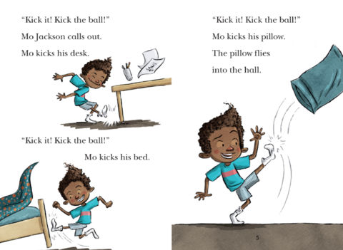 - Words are repeated in an easily recognizable pattern to ensure knowledge retention: This image from pages 4-5 of Kick It, Mo! is an excellent example of the use of repetition of a key word, and similar sections of patterned text happen throughout the books. And that pillow flying out of view is a great example of another criteria, the "page-turning" dynamic. Kids want to find out what will happen next!
